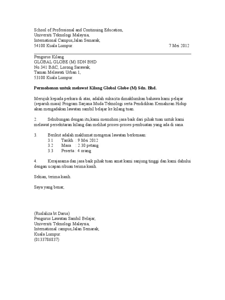 Contoh Surat Rasmi Lawatan Ke Sekolah Surat memohon kebenaran mengadakan lawatan ke kumpulan media karangkraf tarikh. Saya kira iklan kerja ini adalah satu contoh iklan yang memerlukan calon mempunyai kemahiran yang minima. Memohon kebenaran mengadakan lawatan sambil belajar ke kilang.